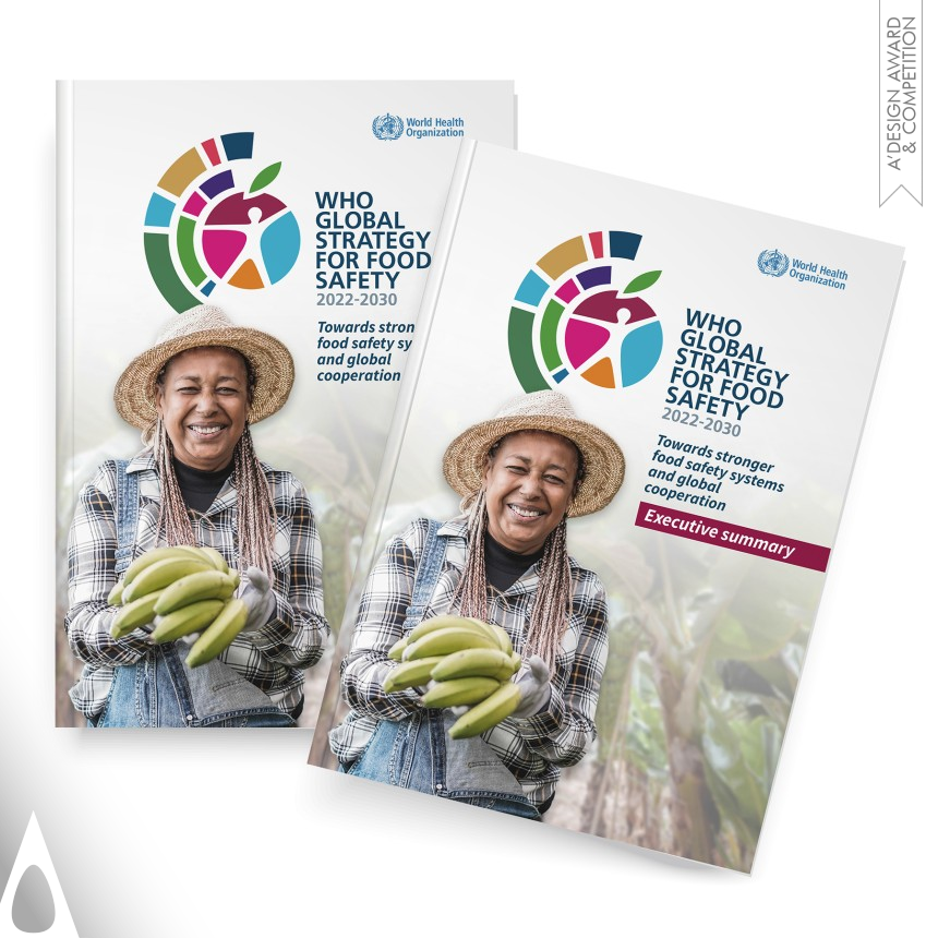The logo, icons, reports, banner, and PowerPoint slides have been designed to highlight the importance of food safety in the supply chain. The designer has used a semi-circle band to represent data analysis and healthy food consumption, which ultimately helps protect human beings. The icons' colour palette matches the report's main strategies. The aim is to create proactive, evidence-based, people-centred, cost-effective food safety systems with coordinated governance and adequate structure supported by relevant photographs. The layout content is supported by visuals that depict each theme.