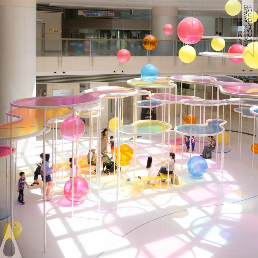 The pavilion is located in a landmark shopping mall in Hong Kong and aimed to celebrate the first summer after the pandemic by creating a colorful and vibrant atmosphere. The design incorporates layers of colorful acrylic panels that reflect sunlight and create shades of different colors on the ground. The strategic positioning of the panels creates an open and accessible space for the public to rest and play. Inspired by the dynamic nature of Hong Kong, the pavilion symbolizes hope, positivity, and the energy of the city.