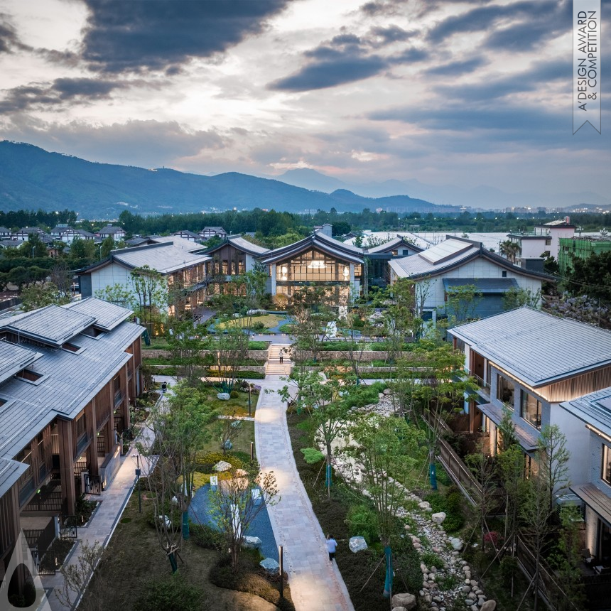 Xichang Joyhub Air Hotel is located on the north shore of Qionghai Sea, which is designed to symbolize a poetic living experience. Create a garden style upscale leisure resort hotel experience in Xichang with a fusion of humanities and natural ecology. Key materials such as artistic paint, wood printed aluminum panels, stone, and wood finishes create a tranquil atmosphere, giving the hotel a unique character. Grey bricks, pitched roofs, and rammed earth walls are reimagined within the interior, where light toned finishes, neutral wooden panels, and deep hued marble create a harmonious space.