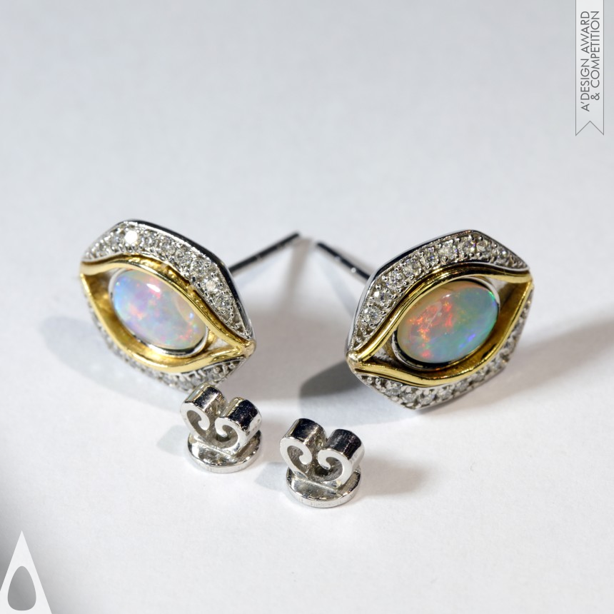 The Galaxie Collection redefines jewelry design by merging cosmic inspiration with meticulous craftsmanship. Derived from the Big Bang, Taichi Yin and Yang, the eye, and the cushion hexagon, the design symbolizes rebirth and prosperity. Australian Crystal Opal, with its vibrant play of color, presents challenges due to its softness and translucency. These were overcome using custom crafted settings and a blackened gold backing, ensuring enhanced fiery hues and durability when paired with 14K white and yellow gold.