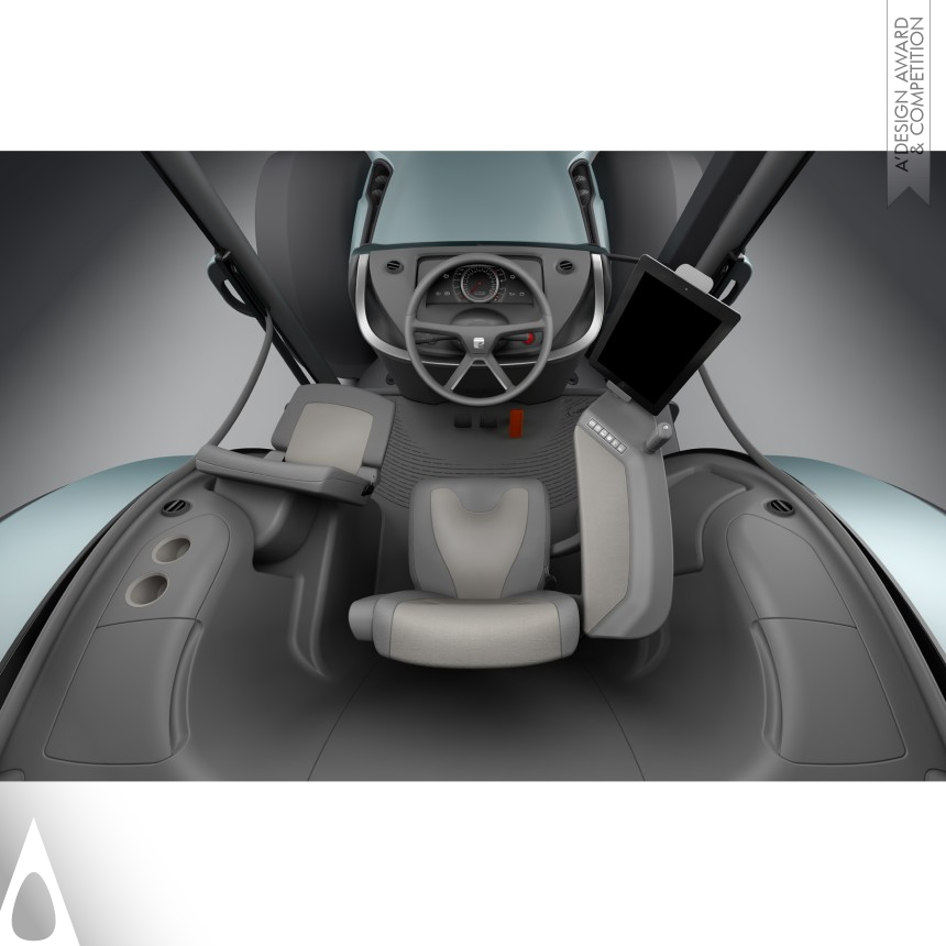 The “São Ville” design study offers a sophisticated approach to the modern agricultural management, simplifying the tractor´s cockpit by applying a cost effective, simple to operate, upgradeable interface represented by a tablet computer. Offering an easy to access and rich in functions platform to the operator, which would be otherwise difficult to implement. Added value is also the full overview and management of the crop by using specific agricultural applications installed on the tablet computer, able to communicate wirelessly with a central office.