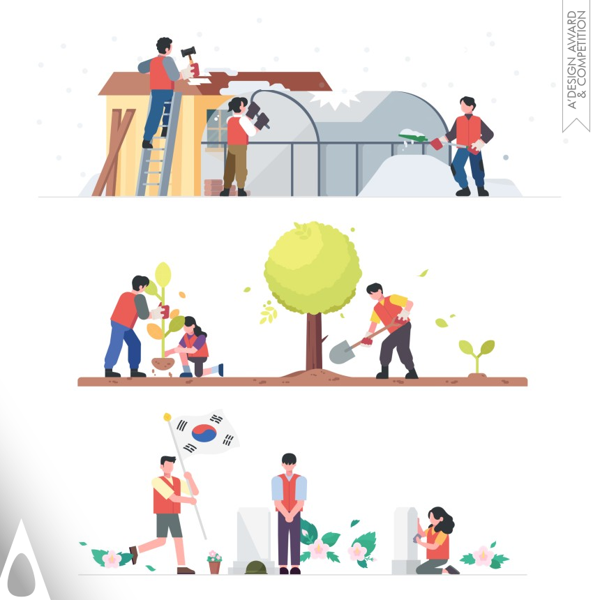 The project is that volunteers settle into daily life and hope to bring about positive social change. The visual assets are all 83 volunteer representative images and consists of 54 graphics, 15 illustrations, and 14 icons. It is designed that people can easily understand what kind of volunteer work is for each category. The graphic is based on a modular design with the theme of volunteer work and people, and Illustration shows various kinds of volunteer work that anyone can do, delivering a familiar feeling.