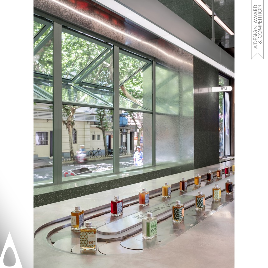 The project is a social retailing and bar for the young generation. This rectangular space entirely clad in green terrazzo tiles. A small section directly opposite houses An elongated counter with a rotating belt laden with cocktail drinks literally takes center stage, and comes with a suspended electronic message board canopy following its contours. Large windows on the street side allow in floods of daylight, but also provide for a seating area with a counter and seven stools.