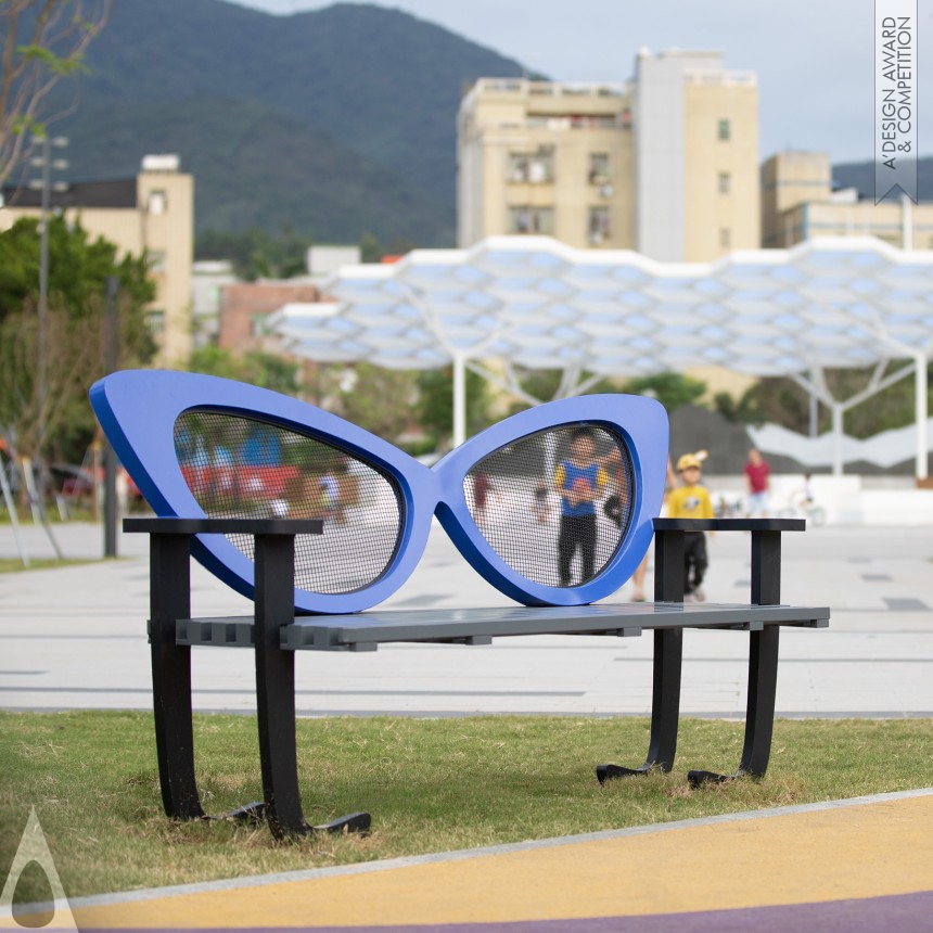 This is an artistic park installation centered around the theme of eyeglasses. The designer incorporates vibrant colors and fashionable elements into the design, integrating them with the eyeglass theme. The installation includes interactive screens, a photo wall, public seating shaped like eyeglasses, and large-scale interactive eyeglass structures, all seamlessly blending into the environment. Visitors can take photos and interact with the installations, enhancing their overall experience. These designs are free of sharp edges, ensuring safety for all.