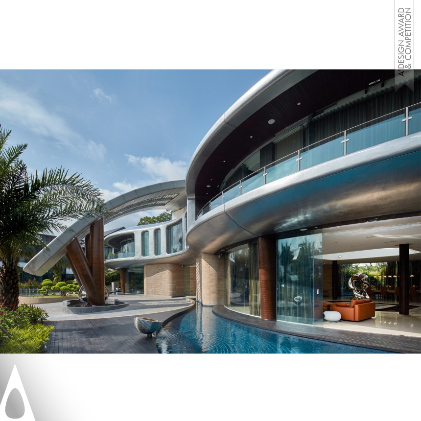 Villa Otto's ‘flying saucer-like' design was conceived with a dynamic elevation. The unique outward thrusting walls and canopies gives the impression of a spacecraft either about to land or take off. The curvaceous interlocking of two circular pavilions forms the lucky number eight in Chinese culture. Despite the voluptuous external form, the internal spaces are largely straight. The vast living, dining and bedrooms emit an opulence to these rooms which seems to celebrate the privacy of personal space as a kind of luxury.
