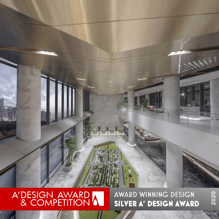 RESEARCH ABSTRACT: The sales office is equipped with water bar area, VIP reception room, children's activity area and other places to bring different experiences to customers. A large number of metal and stone materials are used to make combination of space, people and things. On the basis of hard decoration, soft decoration design deeply expresses the sense of modernity and science and technology. The selection of ornaments and furniture uses the modeling of arc and fold line to give the space a sense of rhythm.