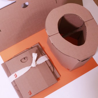 Made of waxed cardboard, it is lightweight, flat-pack and water-resistant.