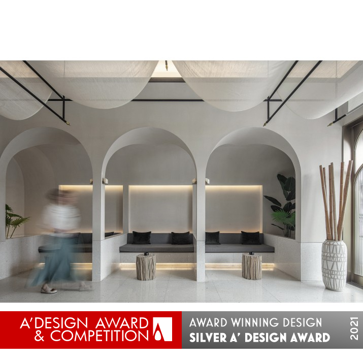 PRODUCTION / REALIZATION TECHNOLOGY: We take stone arches in our design and we also add on the island's broad-leaved trees stretching and the waves stretching to expand the shape of the arch, turn it into continuous cross arch construction, and take it as the cornerstone of space language. In terms of material, we use frosted paint, broken-marble stone and terrazzo to simulate coastal sandstone, so as to create a sense of scene of overlooking the coast through arched windows and introduce nature into the interior.