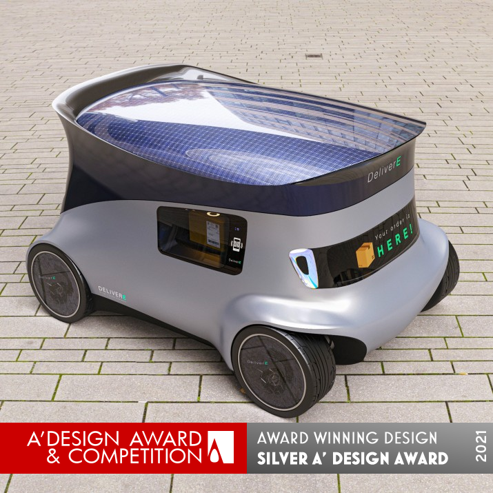 PRODUCTION / REALIZATION TECHNOLOGY: DeliverE is the future standard of mail delivery. Each vehicle is powered by an electric motor, which gets it's energy from a curved solar panel located on the roof, in order to capture more angles of sunlight during the day. Back-up batteries located at the bottom powertrain. Inside the vehicle there is a roll conveyor, which is loaded according to a GPS sequence in advance; determined according to the dispersion distance, in order to optimize resources.