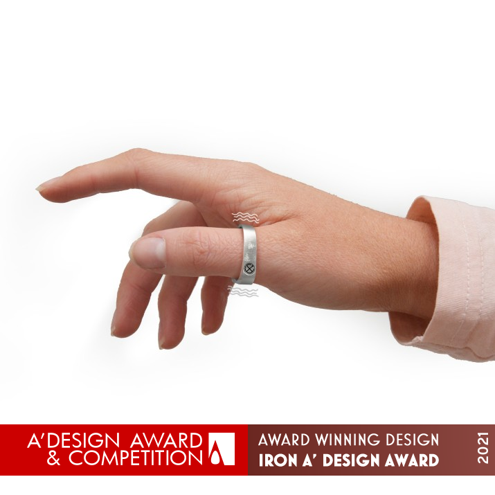 PRODUCTION / REALIZATION TECHNOLOGY: Inside a ring is a transmitter, receiver, vibrator, Photoplethysmography sensor (PPG), Negative Temperature Coefficient (NTC) sensor, Arduino and battery. The earring/pendant transmits and receives information wirelessly to the ring. When the ring and earring/pendant are close, the vibrator in the ring is activated until moved away. The PPG sensor tracks the blood flow under the skin. Body temperature is monitored through a NTC sensor. The Ardunio and transmitter sends this information to the app.
