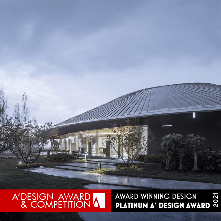 As to layout, water drop shape is placed diagonally into the site, which not only elongates the moving line from the city interface to the entrance, but also makes the shape more intuitive. The profound eaves overhang and large area glass applications create a directionless floating roof, which presents a charming tranquility with the swaying shadows of the trees.