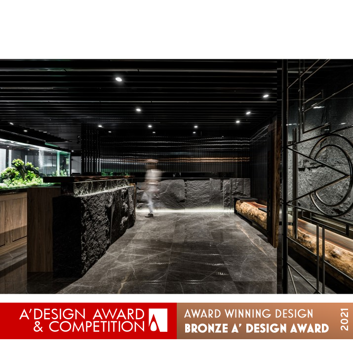 PRODUCTION / REALIZATION TECHNOLOGY: The layout of the room can be divided into reception hallway and counter, public working space, director office, conference room, tea room and others. Huge block made of tree trunk lays at the entrance, which leads the traffic flow and can also be used as a temporary waiting area for visitors. Together with the titanium, stone and vertical lines of metal screen, it creates a generous and solemn modern corporate image. In the public workspace, iron bars cover the ceiling pipes and wires. The waist height partition design, combined with the storage function, not only ensures the privacy of independent work, but also enables employees to discuss or consult information at any time.