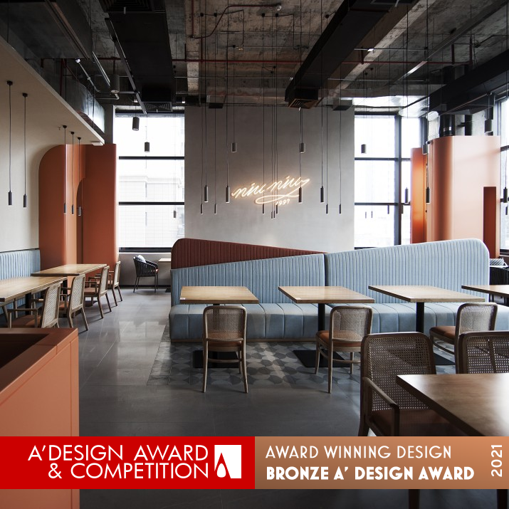 UNIQUE PROPERTIES / PROJECT DESCRIPTION: Re-enhance the concept of reverence for the natural world; show the brand color system more nakedly, and easily interact and dialogue with us in a more direct way. The orange in the space is the main color of NIU NIU WESTERN FOOD. It blends with the earth gray and sky blue in nature. It touches our resonance with visual senses, and once again speaks for the awe of nature.