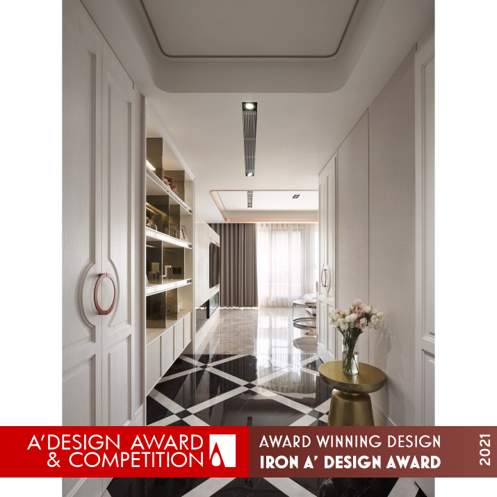 OPERATION / FLOW / INTERACTION: The hallway exudes glamour with a black and beige marble pavement, with the master bedroom, the guest bathroom, and closet hidden behind three delicately sculptured doors.