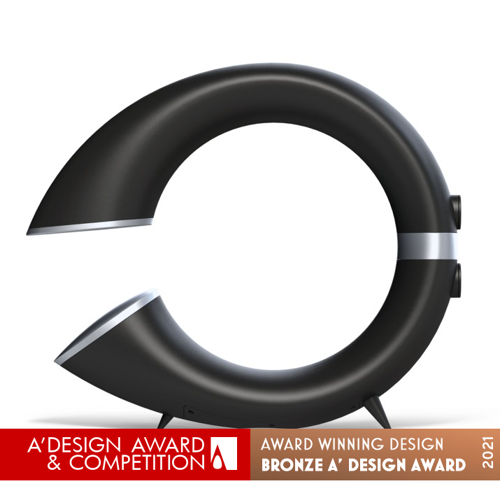 UNIQUE PROPERTIES / PROJECT DESCRIPTION: The primary function of the design is to provide the perfect sound. The design was inspired by the form of a horn (of Chief Lehel, who was a leader in a hungarian myth). The design functionally adjusts to the performances of a speaker, and positions of the internal components. Therefore, a completely new and unique speaker design was born thanks to engineering.