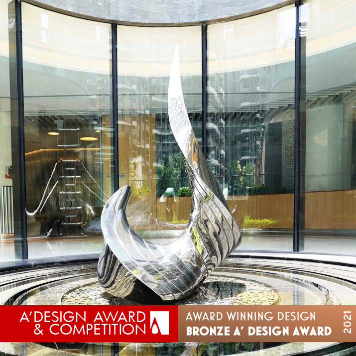 The design uses 3D fabrication technology to create the fluid massing using stainless steel material. With the compliment of reflections from water and polished metal surface, the artwork stands out as a masterpiece within the landscape of the clubhouse, showcasing as a beauty of organic curves and strength.