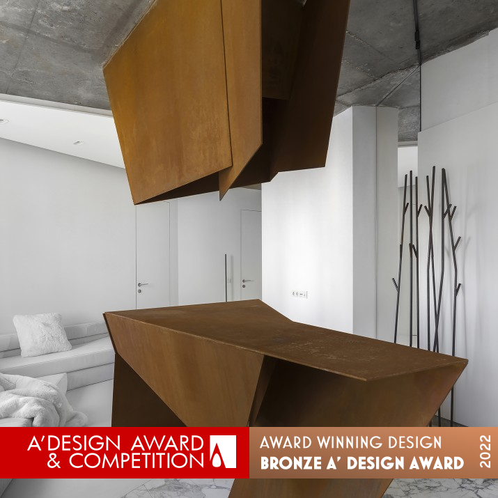UNIQUE PROPERTIES / PROJECT DESCRIPTION: White color, the color of endless space in the supremacist paintings, has evolved in the interior, creating a geometric volume of the whole space. It is self sufficient and also is a background for the interior s main elements geometric dominating sculptures. Thus, this interior is a white background for the linear geometric metal sculptures, consisting of the simple geometry planes, connecting in the three-dimensional monumental compositions.
