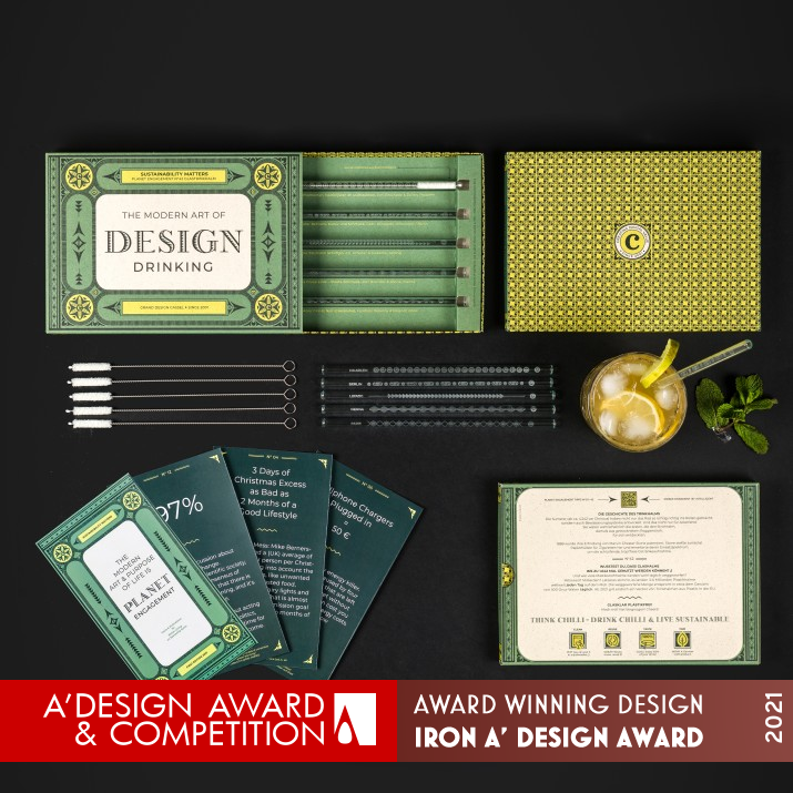 CHALLENGE: The set is a loving homage to the ornamentation of the early 19th century and combines design culture with the sustainability thought of today. The packaging is made of an innovative ecological grass cardboard, the locally produced glass straws sit stably in an individually manufactured inlay with an additional cleaning brush made of cotton fibers. The straws can be cleaned and reused up to 1042 times in the dishwasher. WOW! Drink and enjoy.
