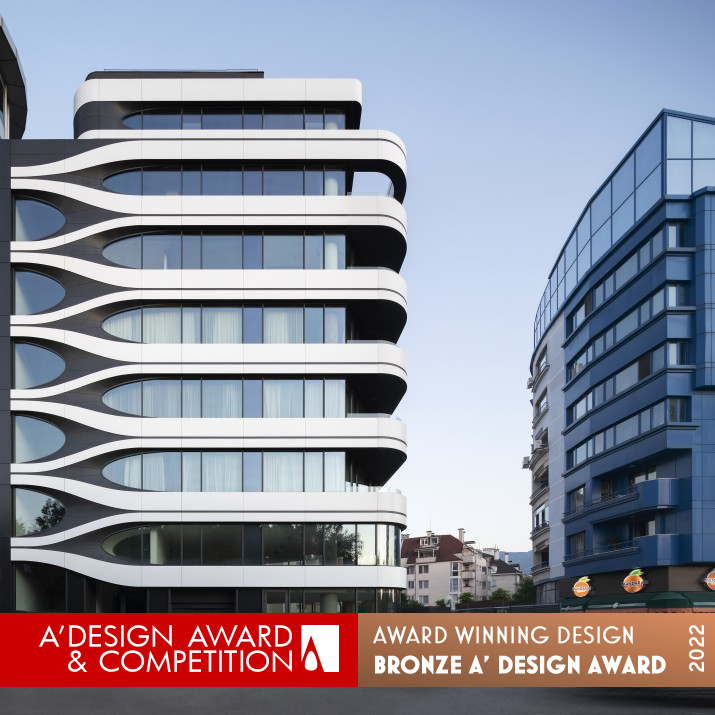 B73 is one of the very few buildings in Bulgaria using solid surface material and thermoforming for complex 3D shapes. The concept of the facade starts from a simple surface that is stretched with strategically placed cuts. A discontinuation occurs creating the shape of a swallow bird.