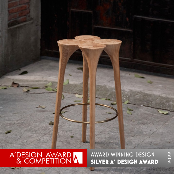 PRODUCTION / REALIZATION TECHNOLOGY: Using Chinese Sun Mao (mortise and tenon joint) technique to connect the four 'leaves' is highly stable. The curvy stool legs are carved by CNC digital control machine in the first step and then fine-tuned by hand polishing. The materials are nature ash or black walnut, with a ring of stainless steel at the bottom for footrest.