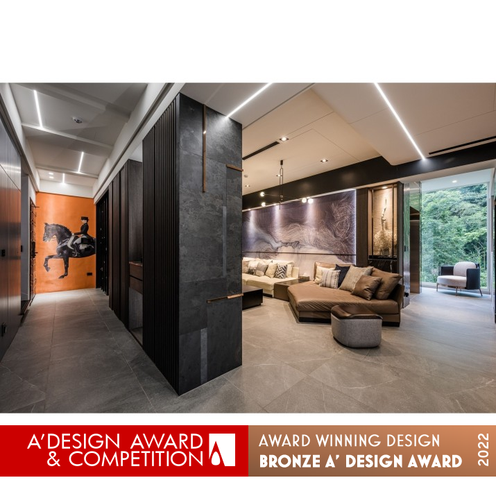 OPERATION / FLOW / INTERACTION: In the public sphere on the first floor, the corridor in the middle of the dining room is used as the axis to delineate the spaces. In the living room, the main TV wall has a circular line to ensure a smooth traffic flow. The stone texture on the floor extends the main wall. The tension of light and dark colors is created by the sharp division of metal lines, which also injects a sense of extravagant. The large painting on the wall behind the sofa is like a sea of clouds. The lines with a sense of rhythm implant a vivid vitality into the space.