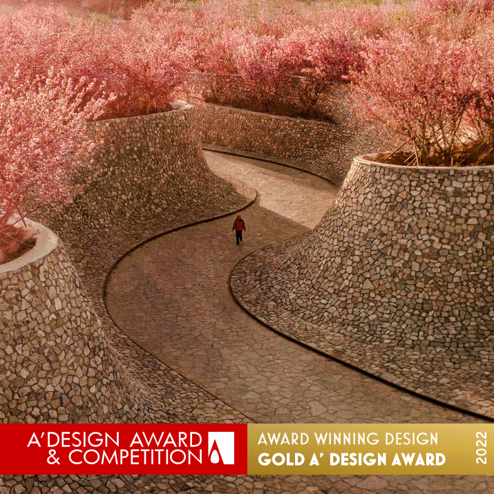 UNIQUE PROPERTIES / PROJECT DESCRIPTION: The client proposed to bring a natural but artistic atmosphere to the site. The project respects the original natural mountain atmosphere and the essence of the orchard. It features three elements: The design of a pure cherry orchard, elevated in the sky. A base of emerging curved textured walls made from local granite boulders form a strong image and blur the boundary of vertical wall and horizontal path. Winding roads covered in cherry blossom petals complete the impression of the forest valley.