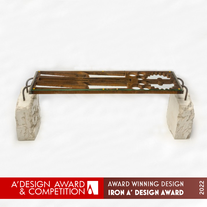 PRODUCTION / REALIZATION TECHNOLOGY: The tabletop is made from 70mm S355 steel which was used for producing machine parts. The shapes are made by the oxygen cutting process and when no more parts could come from the plate, it became scrap metal. This was outside, which gave after 2 years in the rain and sun the current look. The reinforcement steel rods where then first forged in an arch and then welded to the tabletop. After making a steel mold, the reinforcement steel was place in the mold and then covered in regular concrete.