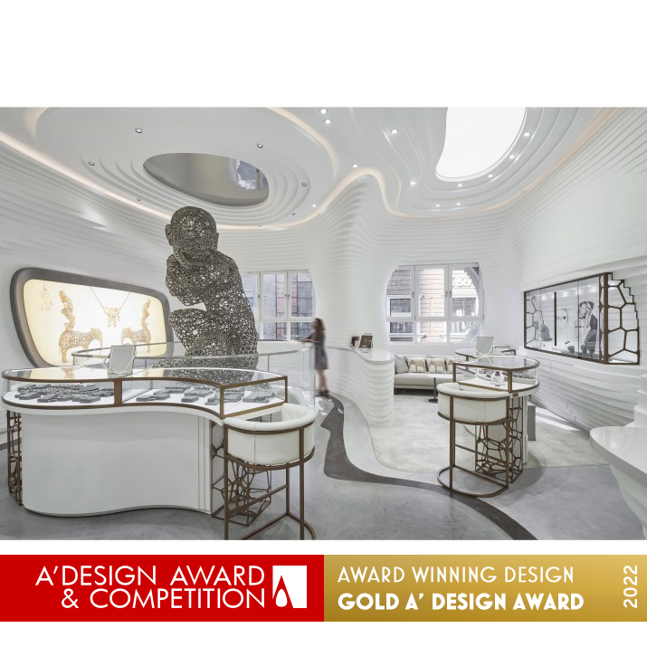 INSPIRATION: Responding to the program of the jewelry retail space, this project draws upon many of the symbolically referential elements related to the extraction, manufacture and distribution of rare stones. The attenuation of the walls, the sculpture and the geometric systems employed throughout the design serve to subtly draw attention to the larger ecosystem of this global economy. While we choose not to publicly or explicitly express our position as individuals, our intent is to promote awareness around the larger network inherent to the retail industry by presenting elements related to the production of goods. Beyond the physical artifacts within the space, the precise manifestation of these features are informed by processes incorporated in the production of goods. Lost-wax casting, carving and faceting are all presented as prominent design elements, while the translation of scale and utility suggest redefined meaning.