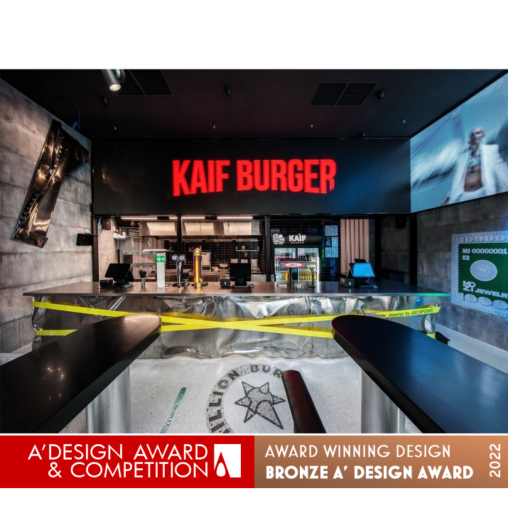 OPERATION / FLOW / INTERACTION: Kaif Burger is a trendy place with dynamic interior that focuses on fast food. The burger joint is supposed to be crowded, that is why the architects provided the distribution of flows via different doors for entrance and exit. The idea of motion is reflected by giant digital screens. The menu and provocative music videos of Morgenstern are being displayed on them.