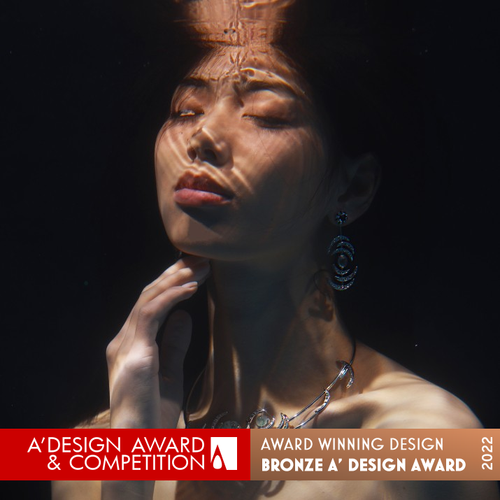 UNIQUE PROPERTIES / PROJECT DESCRIPTION: This set was made with specially cut jadeite unlike no other. These unique inclusions decorate the gem, like flowing plants in a drop of water. A total of 189 princess cut diamonds with slotted inner edges make up the ripples. It mimics the slow expansion of waves from the inside out. The necklace was made in one-piece molding stretchy hollow gold to minimize the weight. Taking ergonomics into account, it was built on five different layers to embrace the body curvatures.