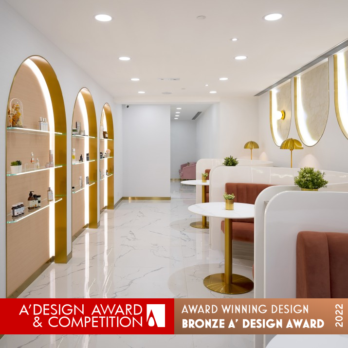 INSPIRATION: The intention of the design is to connect with youthful customers and enhance their comfy experience journey under their new youthful lady brand. By using materials like marble, velvet, wood, and champagne gold stainless steel with pink elements, the interior space is made to feel more sophisticated than a old school style clinical Cosmetology Centre.