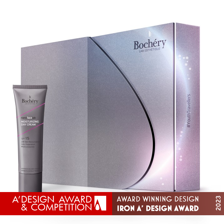 UNIQUE PROPERTIES / PROJECT DESCRIPTION: The box is designed using the logo (an illuminated drop) as a gate you need to pass through, so you can enter Bochery’s world and reach your true self. The illuminating elements deliver the message of the radiance associated with self-care and the colors compliment the cosmic concept of existence.