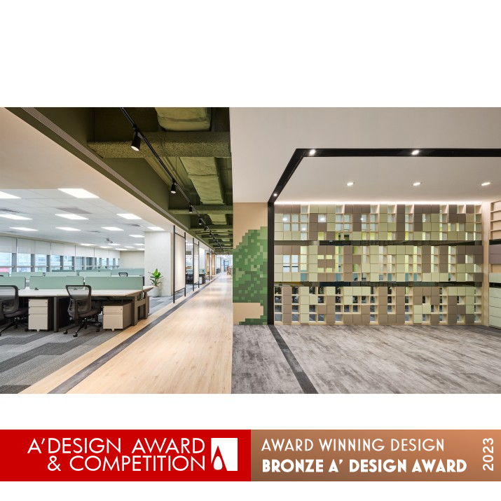 INSPIRATION: The designer uses a combination of different color panels on the corporate signature wall at the entrance to outline the corporate name. It can be reordered to feature other holidays and festive seasons, creating a diverse look. What is more, the pixel style continues to be applied to the corporate logo to enliven the impression of the space. The green, yellow and taupe tones are used as the main color scheme of the lounge area, creating a soft and comfortable vibe. The corridor with light brown wooden floor and grass green ceiling not only creates a unique aesthetic effect but also echoes the color configuration of the corporate logo.