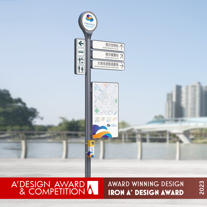 INSPIRATION: Dagang Block is a component of Nansha District, Guangzhou, and is defined as an intelligent manufacturing base during the construction of the new city. Combining intelligence, cloud technology, and the ocean and flower sea streamers that echo Guangzhou Nansha, we have designed a logo that meets the definition of its new city, and extended auxiliary environmental graphics to apply them to various facilities and equipment in the urban area, optimizing the visual image of the overall urban area, and improving the environmental visual effect of the project.