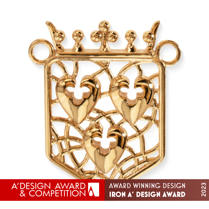 RESEARCH ABSTRACT: The research was to explore the possibility of conveying the coat of arms in a way that would make it the prototype of an elegant jewelry that could be worn to events and on a daily basis. Rather than simply hanging the coat of arms around one's neck, the idea was to use its shape and elements, so that even those who know nothing of this particular town would find it attractive. In other words, the goal was to create jewelry that was spectacular, stylish, and at the same time unmistakably Made in Wavre.