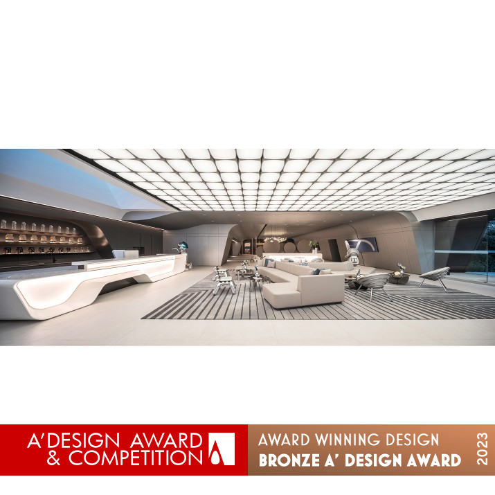 OPERATION / FLOW / INTERACTION: The white bar is made of artificial stone, and its smooth lines and gloss reflect the characteristic streamline of space furniture.The polished stainless steel furniture presents a mirror effect, and the colored transparent gel furniture expresses the space atmosphere of future science and technology.