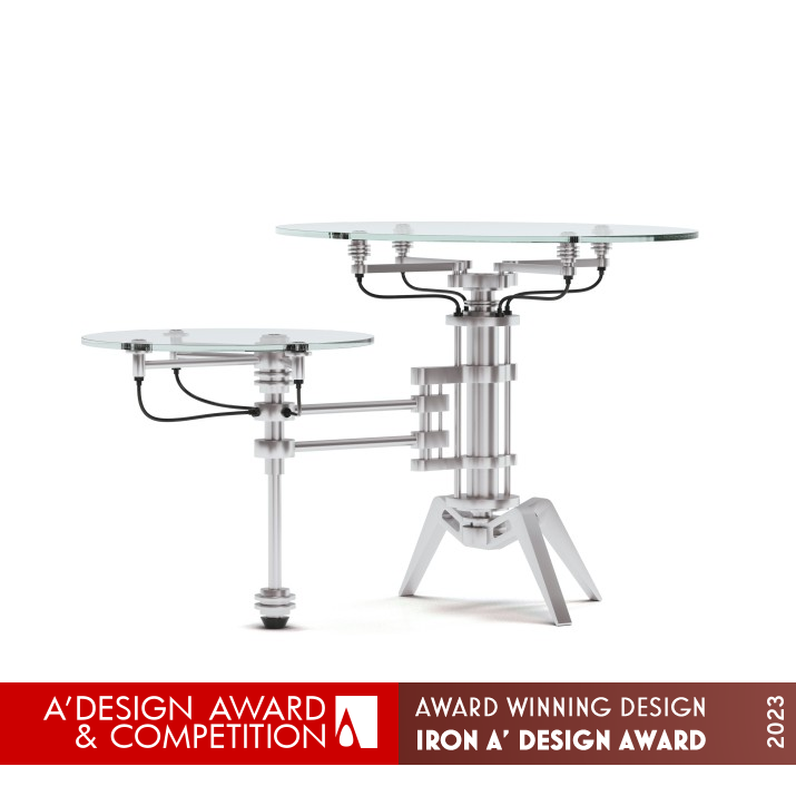 UNIQUE PROPERTIES / PROJECT DESCRIPTION: This chess table is a one-of-a-kind piece that takes inspiration from the late industrial revolution era. It features an asymmetrical design made up of aluminum elements that support two oval glass tops. The topmost glass serves as the playing surface for chess while the lower one can hold beverages or other items. The table has a shiny and intricate appearance, with a complex base consisting of two vertical shafts connected by horizontal extensions. The main shaft has four subsystems with four arms extending from a ring to support the glass top and three stabilizing legs at the bottom. An extension from the middle of the main shaft runs to a lean shaft that functions as a fourth leg and supports the second glass top. The table combines form and function in a sophisticated and stylish way, making it a unique piece of furniture.