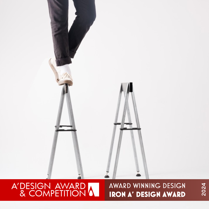 OPERATION / FLOW / INTERACTION: The product was created to embody simplicity in both manufacturing and assembly. Assembling the trestles is easily, quickly, and efficiently accomplished, accompanied by a distinct clicking sound that signifies the trestles are locked. The legs are adjustable to uphold the principles of universality and adaptability to any possible surface, while the chosen material is a simple industrial metal, ensuring the product's longevity.