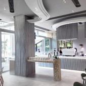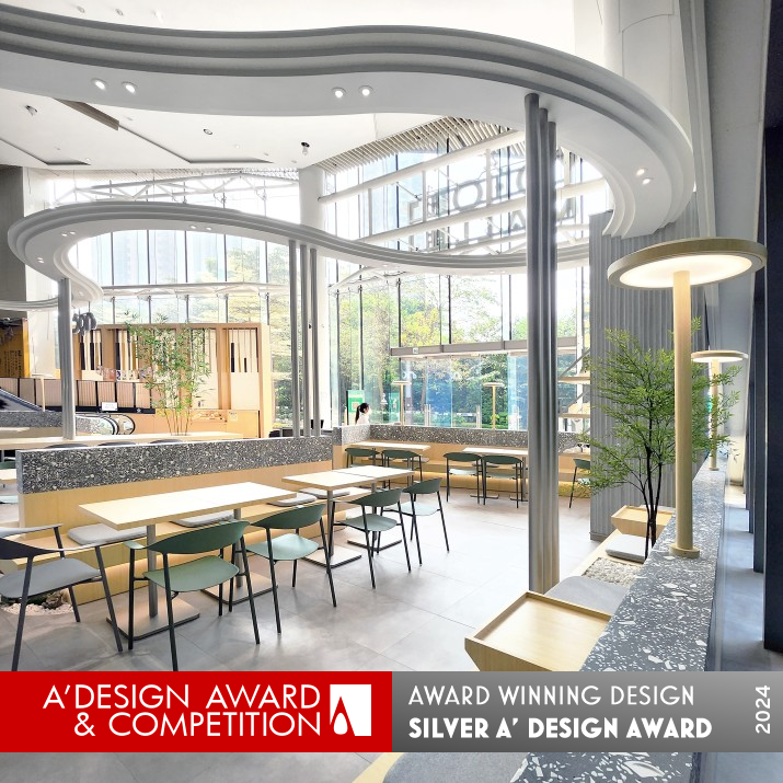 PRODUCTION / REALIZATION TECHNOLOGY: Sustainability was a key consideration in the design, incorporating environmental concepts that emphasize the use of recycled and regenerated materials to showcase the art of green living and make a contribution to sustainable development. The seats in the venue are adorned with grey-toned terrazzo with white stones made from crushed and recycled ceramic coffee cup fragments mixed with terrazzo. The cement board with bamboo pattern is regenerated from pulverized powder of building waste from different dismantled buildings. The use of thin bamboo laminate instead of wood laminate is a nod to the rapid growth cycle of bamboo compared to that of trees. The seating in the Japanese garden style invites visitors to sit quietly and contemplate the inner garden from different angles, with each position offering a unique perspective. When the sun shines through inside from the curtain wall, the most amazing and modern garden landscape that is nothing short of enchanting.