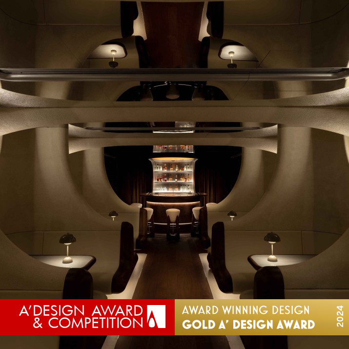 Inside the main bar, rib-like structures reminiscent of cisterns greet guests. Ambient lighting emphasizes the bold arches, creating a serene ambiance. The arches continue down to form intimate booth seatings, providing comfort and style.