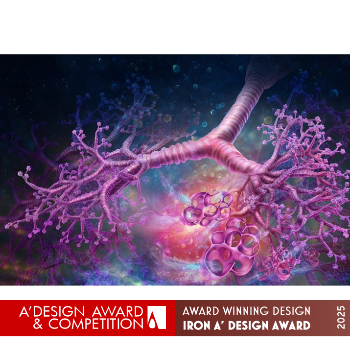 RESEARCH ABSTRACT: The artist reviewed bronchial anatomy and the pathophysiological changes of emphysema by studying radiological images and cat scan images to ensure accuracy. She then built a complex bronchiole tree using rendered 3D models, and hand-painted the structural alterations of the lung’s alveoli air sacs that occur in the chronic obstructive pulmonary disease of emphysema. As the walls of the alveoli become thin, they break down and merge, forming larger, fewer air sacs. This creates one larger air space instead of many small ones and reduces the surface area available for gas exchange. The remaining alveoli become abnormally large and inflated, further reducing the surface area for gas exchange. This cumulative structural change in the tissue causes the lungs to become less elastic, making it difficult to exhale air effectively.