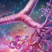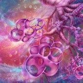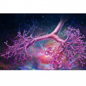 UNIQUE PROPERTIES / PROJECT DESCRIPTION: A conceptual illustration of an inner space landscape of emphysemic alveoli, highlighting collapsed bronchioles and damaged alveolar air sacs. The inner walls of the alveoli rupture and create enlarged air sacs, resulting in inefficient oxygen exchange and diminished respiration. Temple Health Lung Center is a national leader in diagnosing and treating lung disease. The Center desired a conceptual illustration of emphysemic changes in alveoli for marketing purposes.