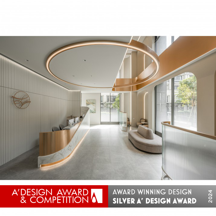 RESEARCH ABSTRACT: The study focuses on the harmonious combination of circular and linear geometric shapes, incorporating arcs, organic lines, and hues resembling human skin tones in the spatial design. This aims to instill a sense of calmness within individuals in the space and alleviate the tension associated with medical procedures. Furthermore, a deep understanding of the distinctions between medical aesthetics clinics and other healthcare or commercial spaces is undertaken. This includes analyzing the internal staff's flow, customer behavior, and circulation, while also recognizing the necessity to appropriately avoid sightline intersections.