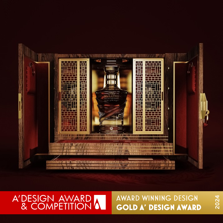 PRODUCTION / REALIZATION TECHNOLOGY: Wooden components were added to the bottle structure as a direct homage to the Wood Dragon and the casks used to create The Mulong whiskey. To balance them, metallic trims inspired by Chinese patterns reflect the temple structure at the top of the bottle, where a closure is inscribed with words of positive value, that have to be rotated into a certain pattern in order to unleash the closure itself. The box further extends this process, where hidden keys unlock the bottle holder and riser itself.