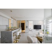 UNIQUE PROPERTIES / PROJECT DESCRIPTION: The space was initially dark, damp, and musty, with walnut tones restricting natural light. The designer adjusted pathways, partitions, and plumbing, updating the facade with light-colored lacquer to enhance brightness. Rounded edges replaced sharp angles, creating a warm atmosphere. To meet the owners' needs, social and private areas were separated. The dining area was transformed into a computer room with glass partitions for entertainment. A voice-controlled system with smart lighting and scene settings improved convenience and comfort.