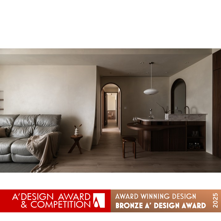 UNIQUE PROPERTIES / PROJECT DESCRIPTION: The design behind the sofa wall symbolizes the beginning of a new life chapter. A small corner is removed to represent the turning of a page, adding dynamism to the space. The open shelf in this area holds memorabilia, while the wall separates social and private zones, making daily life feel like the turning of a book page. The rounded walls and door frames, embodying the wabi-sabi style, create a cave-like feeling, offering security. The dining area was redefined as a versatile kitchen island, blending functionality with fluidity, ensuring a flexible and practical space.