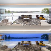 the heart of the home, features a grand living and dining room is located on the second floor. This level seamlessly integrates indoor and outdoor spaces with the use of strategically placed columns that support a remarkable 12-meter cantilever. Sliding doors extend the space by up to 20 meters, opening to a terrace and an infinity pool that offers an uninterrupted river view.