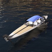 PRODUCTION / REALIZATION TECHNOLOGY: The boat's hull is made of aluminum with a platinum-colored metallic paint finish that echoes the glossy metal used throughout, providing a good sense of texture. The hydrofoils and hull support structures have versatile attributes and are made of stronger carbon fiber and other composite materials that add to the boat's sporty feel. The canvas soft top of the canopy is made of a high-grade fabric mixed with metallic filaments. Meanwhile, the luggage compartment deck is made of high-grade teak, adding to the boat's luxurious feel.