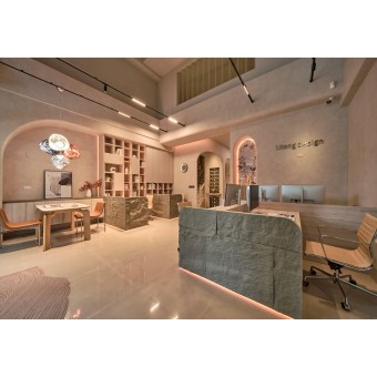 OPERATION / FLOW / INTERACTION: The front door opens into a semi-open layout, inviting a sense of depth and transparency. Not only does the semi-open floor plan create a sense of spaciousness and flow, but it also makes the best use of the space. On the first floor, partition walls separate the office area from the break room. The walls are covered with hand-applied plaster, offering a warm, textured surface that evokes a sense of authenticity that resonates with the Wabi-Sabi ethos. The seating area features partitions with rough stone veneer, continuing the natural and unrefined aesthetic. The partition wall behind is accented with fair-faced concrete hollow bricks, adding a harmonious touch to the space's overall tone. On the ceiling, the beam is softened with gentle curves to smooth out sharp angles. The rounded curves on the feature wall and corridor create a harmonious sense of visual continuity throughout the space.