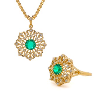 UNIQUE PROPERTIES / PROJECT DESCRIPTION: Crafted from 18k yellow gold, the Diamond Lace Collection offers a luxurious set of handcrafted high jewelry pieces. Featuring a stunning statement ring, pendant, and earrings adorned with natural diamonds and centered with captivating emeralds, this collection showcases a delicate lace-like pattern that exudes opulence and sophistication. Drawing inspiration from classical music, the artist has created truly beautiful designs in this lace jewelry set.